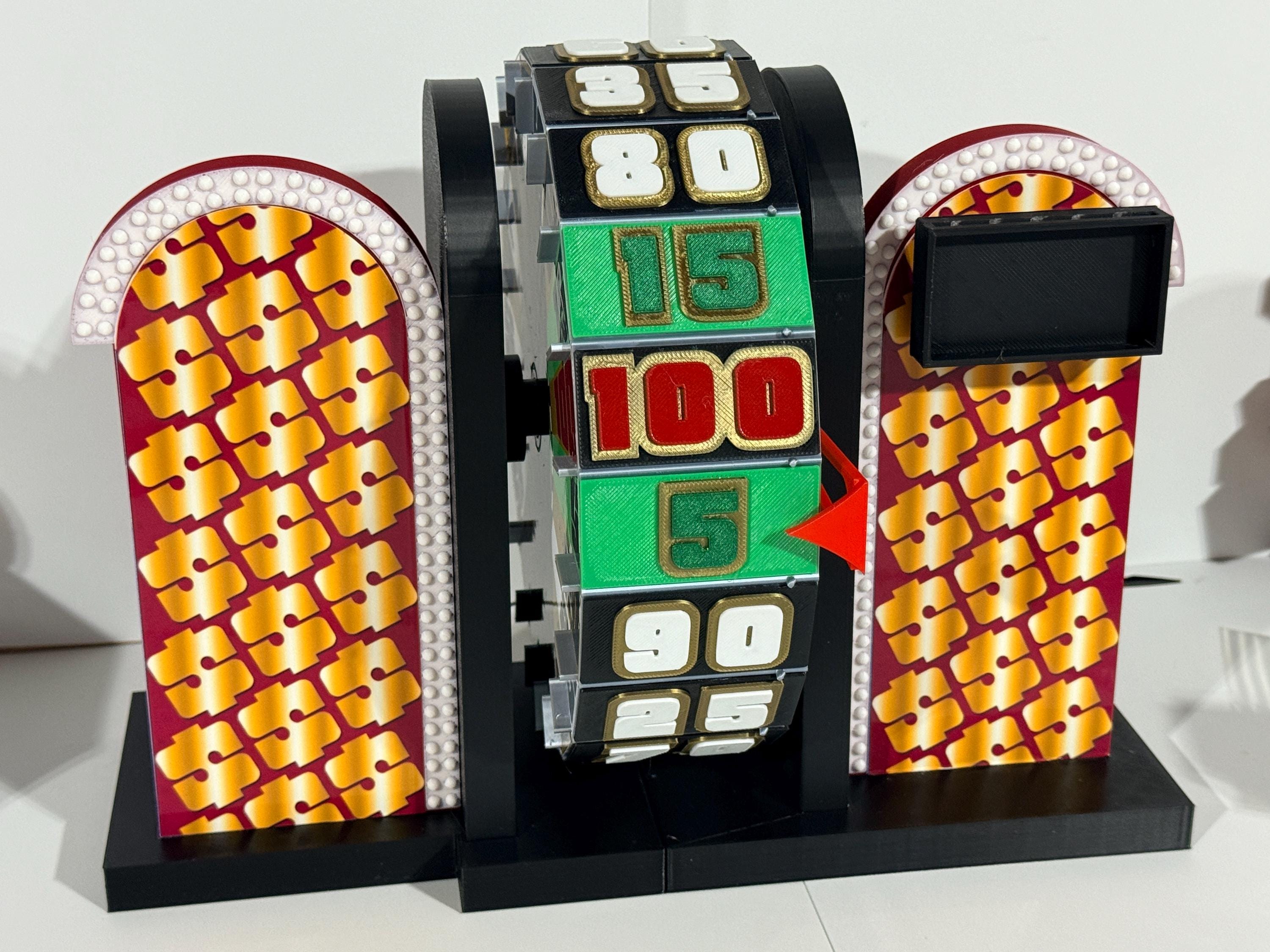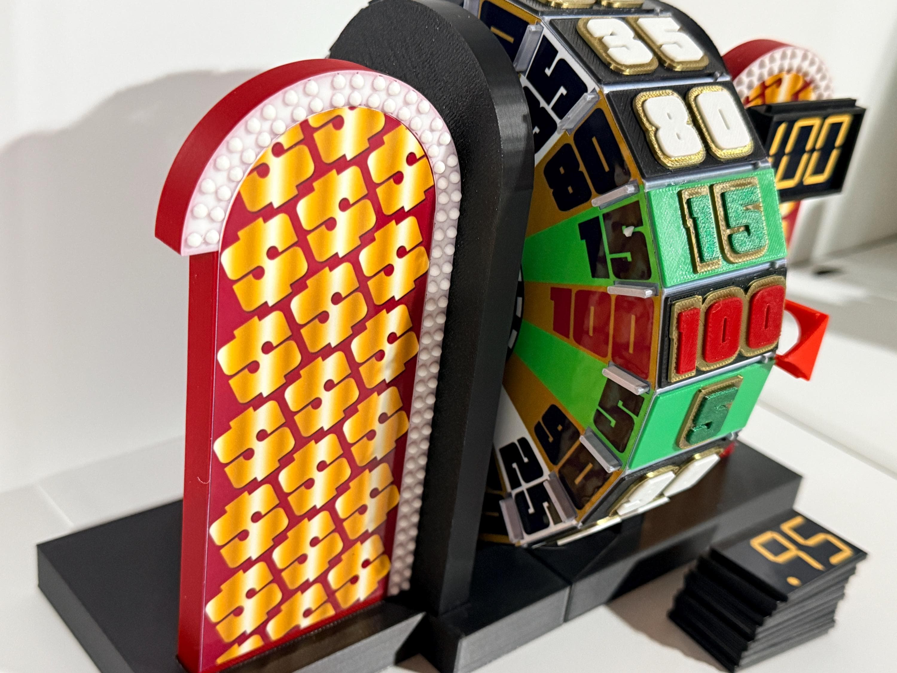 A "Full Version" includes the wheel, base, arrow, and 4 walls. The wheel numbers are 3-dimensional and are 3D printed as seen in the last photo. The Side Panels are a decal, and the scoreboard is black and non-functional.