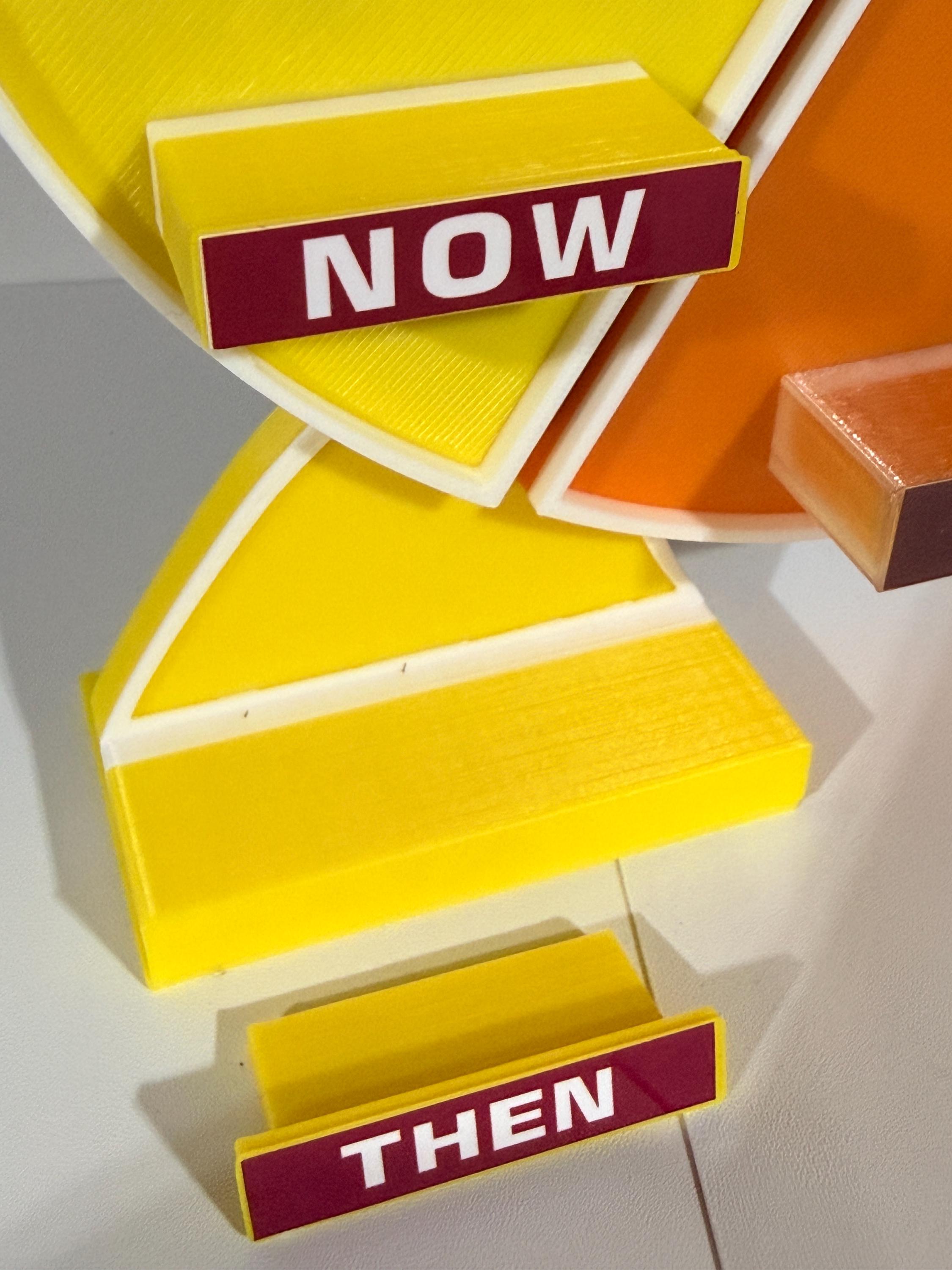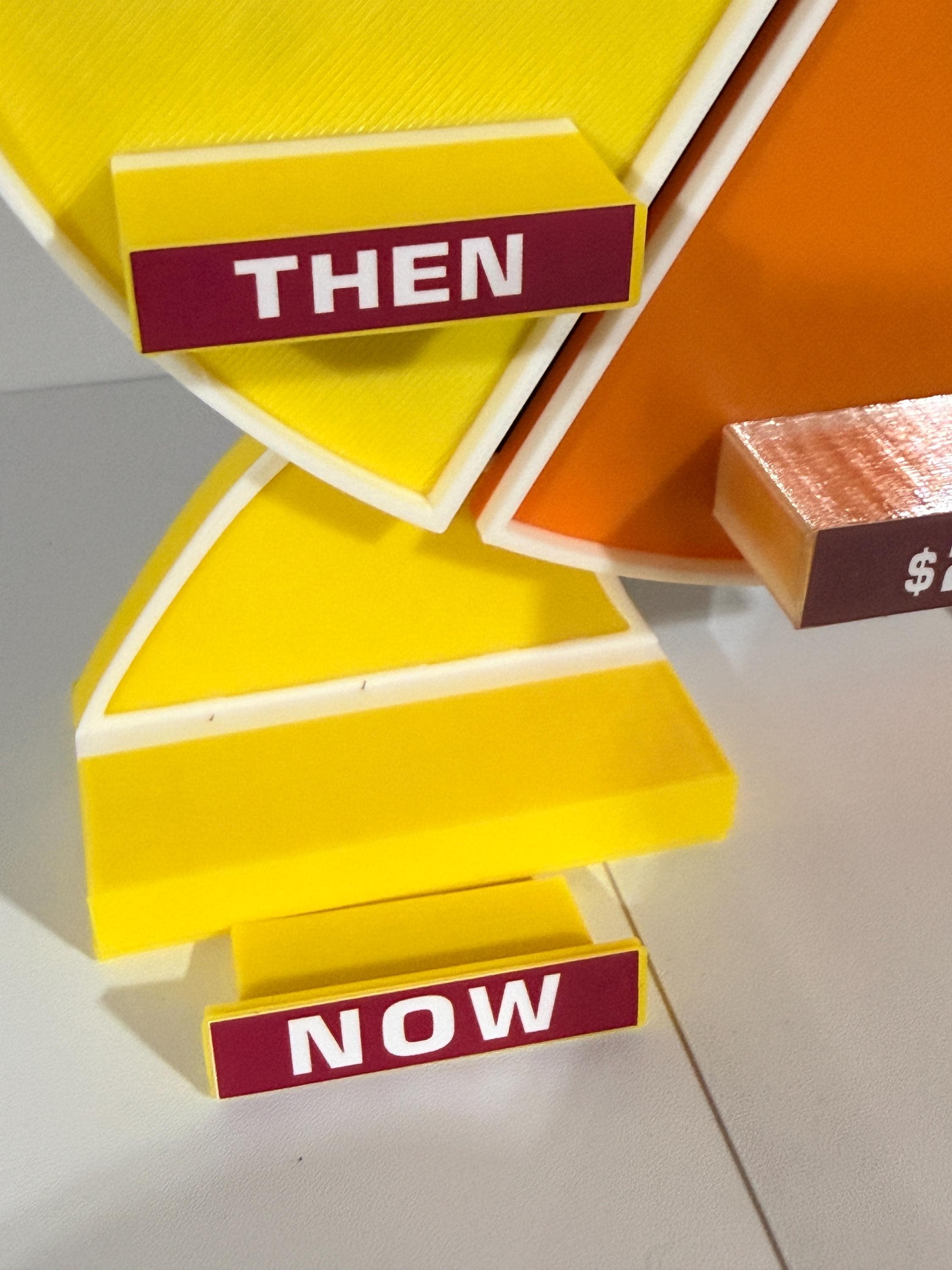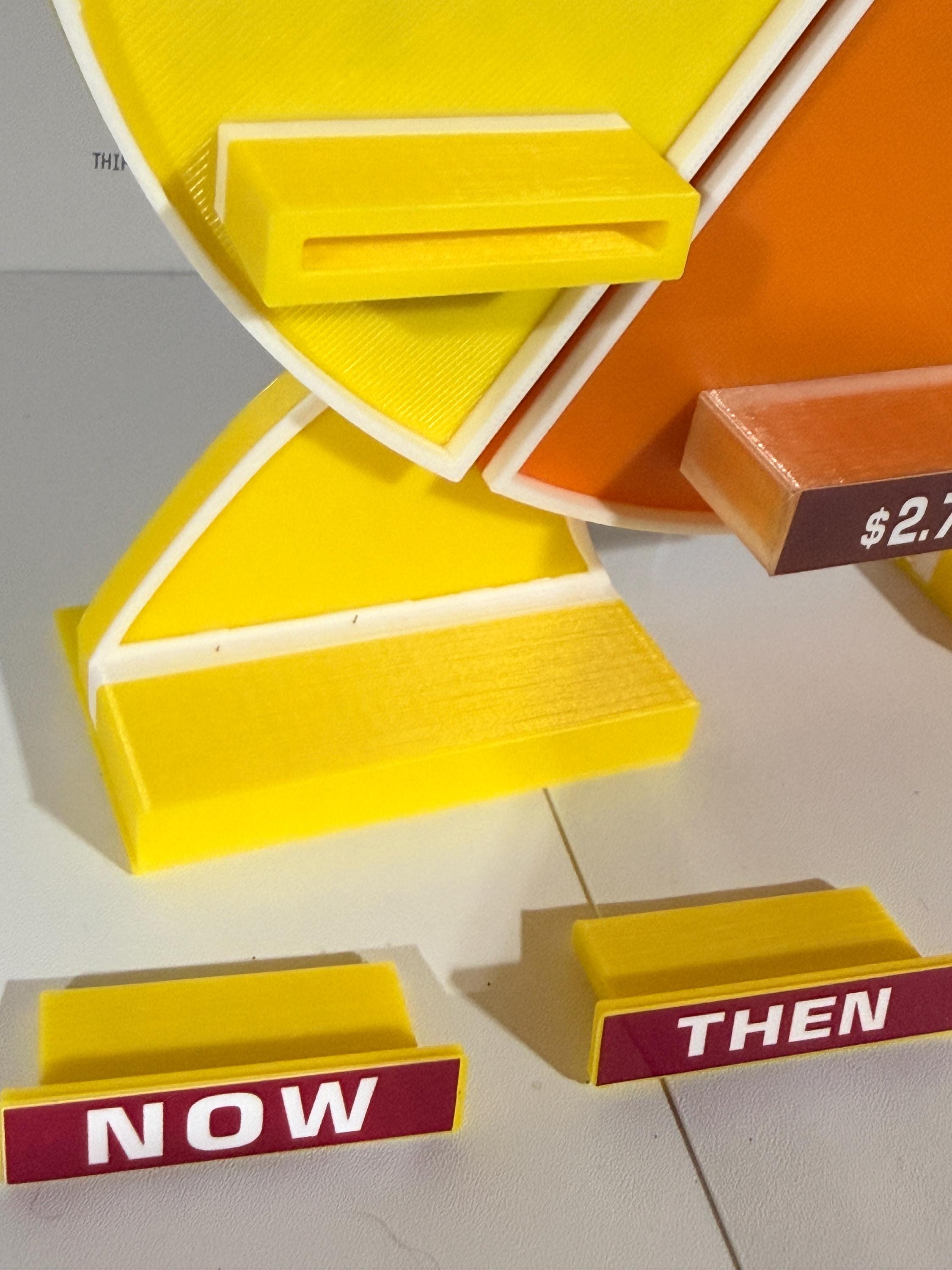 The NOW or THEN is revealed by sliding off the clear shelf cap that has the price on it. Simply place the grocery item back on the shelf after the reveal.